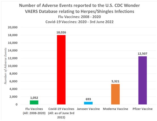 CDCのWonder Vaccine Adverse Event Reporting System(VAERS)データベースによると、2022年6月3日現在、CDCはCovid-19注射の副反応として発生したヘルペスと帯状疱疹感染に関する1万8026件の報告を処理した。