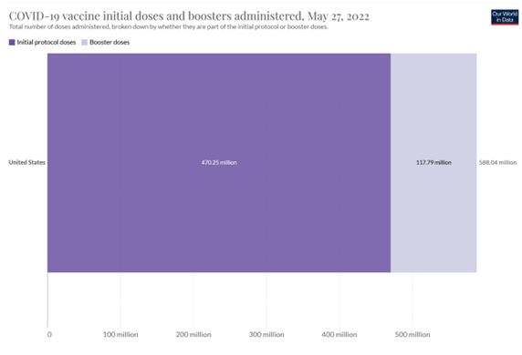 しかし、「Our World in Data」によると、2022年5月27日現在、アメリカでは5億8804万本のCovid-19注射が投与されたに過ぎないのだそうだ。