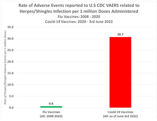 しかし、2022年6月3日までの公式データに基づくと、米国で投与されたCovid-19ワクチン100万回当たり、ヘルペス/帯状疱疹感染に関連する有害事象は30.7件発生している。