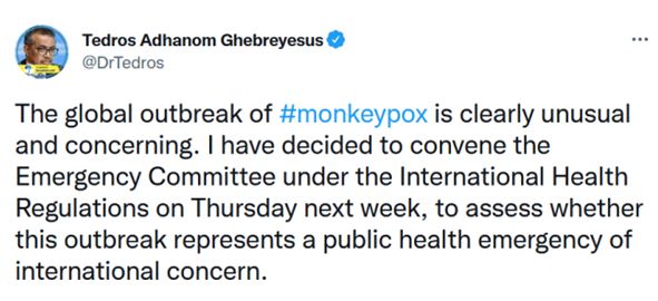 世界保健機関の緊急委員会は、2022年6月23日(木)に会合を開き、サル痘の発生疑惑が国際的に懸念される公衆衛生上の緊急事態を意味するかどうかを評価することになっている。