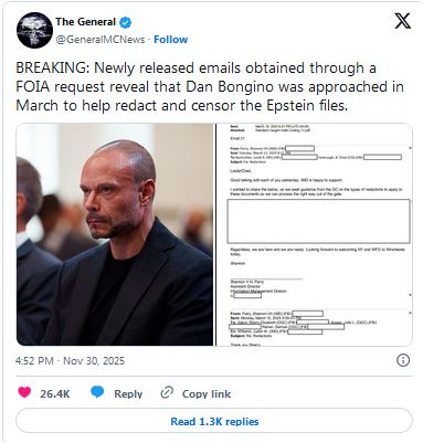速報:FOIAリクエストを通じて入手した新たに公開された電子メールにより、ダン・ボンジーノ[Dan Bongino]が3月にエプスタインファイルの編集と検閲を支援するよう打診されたことが明らかになった。pic.twitter.com/3lXqZDggi3