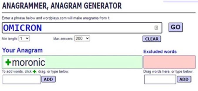 SARS-CoV-2の「専門家」によれば、このウイルスには多くの系統があり、それぞれが前回よりも致死性が高い(あるいは低い)可能性があるとそうです。騙されやすい、教育を受けていない大衆だけが、最新の変異株を恐れるのです。 OMICRON(オミクロン)です。これは文字通り「MORONIC(バカな)」のアナグラムです。