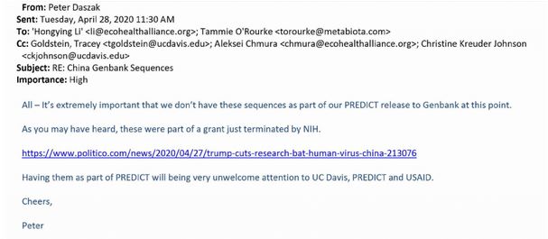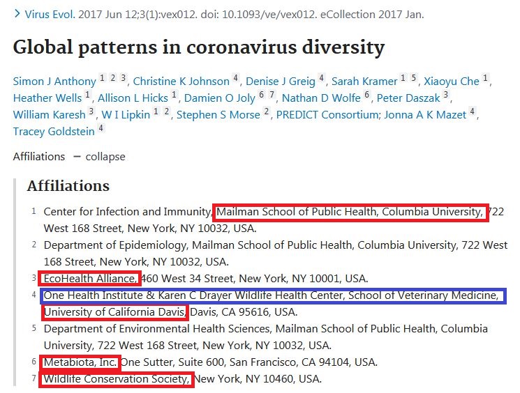 EHAの上級副会長ウィリアム・カレシュ[William Karesh]も著者として名を連ねていました。ダスザックとカレシュの会は、現在では武漢ウイルス研究所(WIV)の長年のパートナーであり、そこはファウチフルーが「逃亡」したと考えられている場所であることが分かっています。