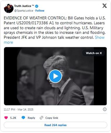気象制御の証拠:ビル・ゲイツは、ハリケーンを制御するための米国特許US2009/0173386 A1を保有している。レーザーが、雨雲と稲妻を作成するために使用される。米軍は雨と洪水を増加させるために、空に化学物質を噴霧している。 JFK大統領と副大統領ジョンソンは気象制御について話している。 pic.twitter.com/jeAI4E8uRZ