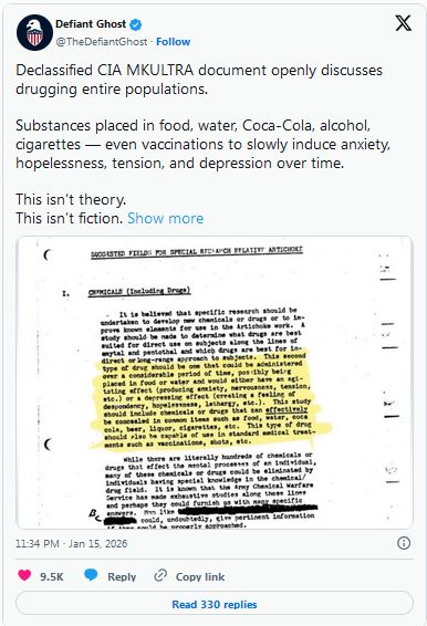 Declassified CIA MKULTRA Files Expose ‘Mass Drugging’ With Chemtrails and Vaccines to Control Entire Populations January 17, 2026 Baxter Dmitry News, US 4 Comments