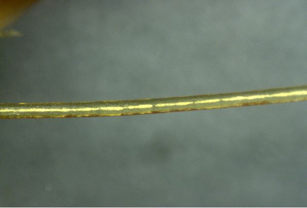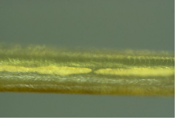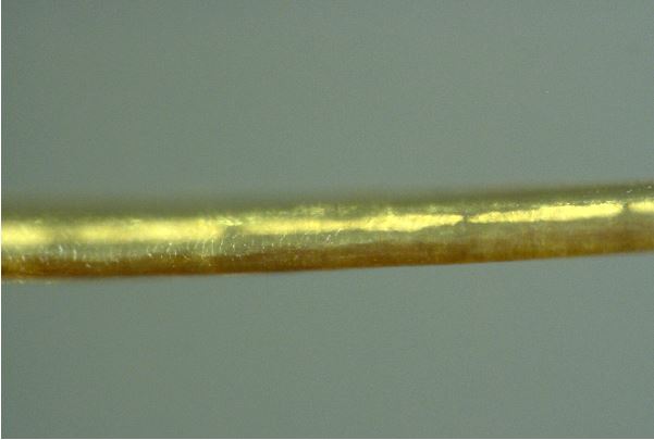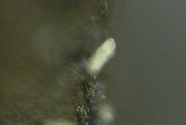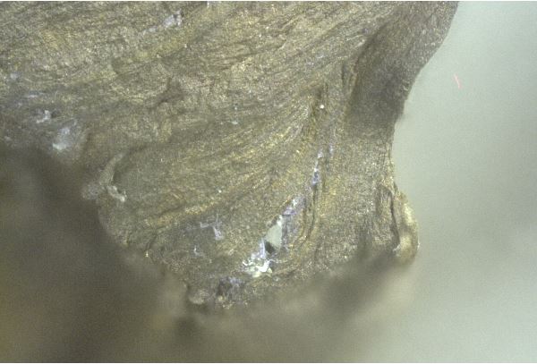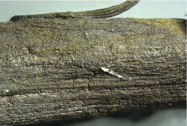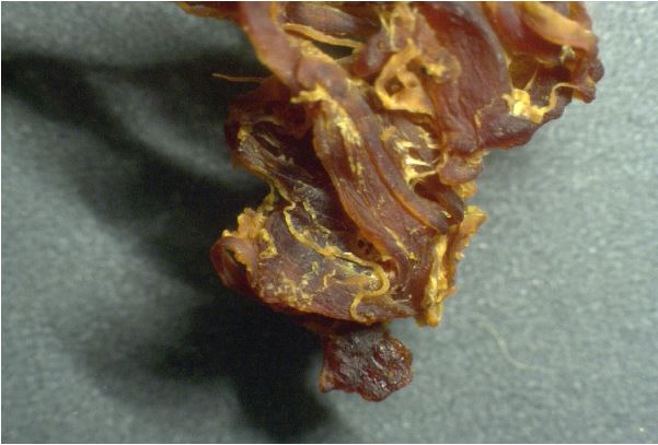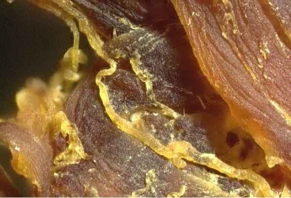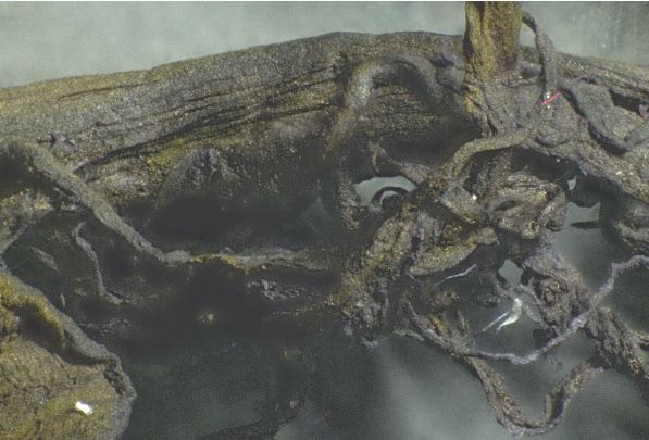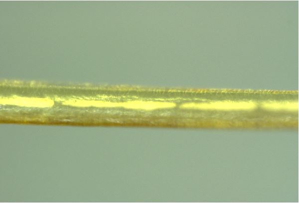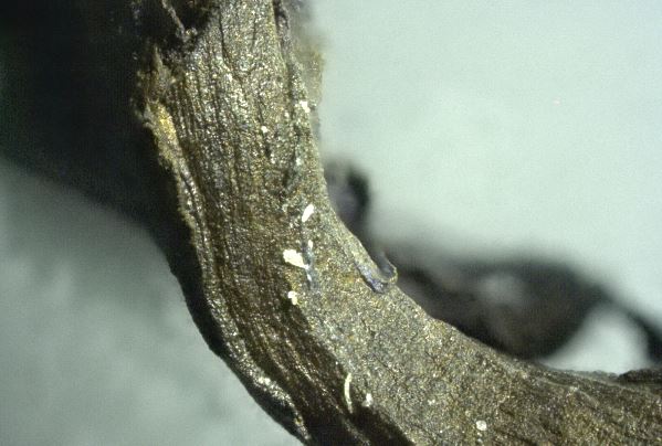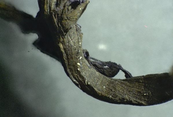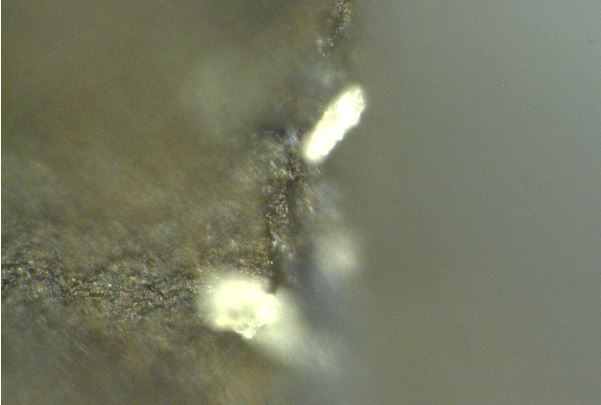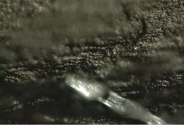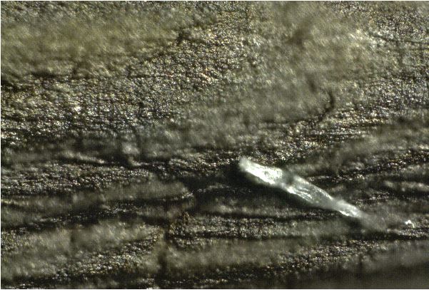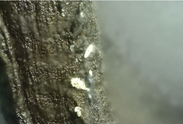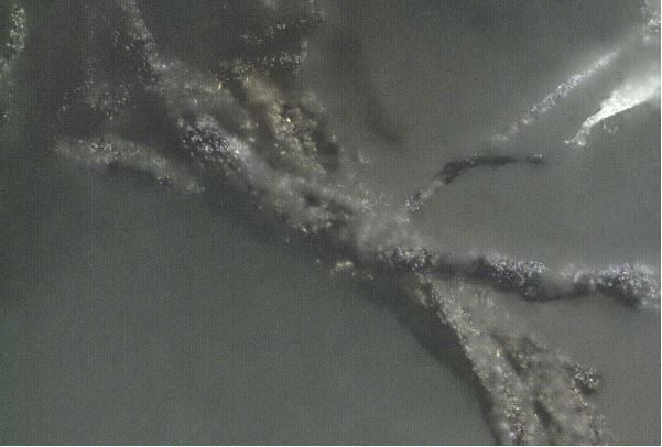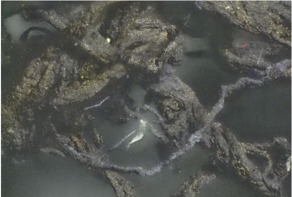 3. 硝酸分解後の血餅の顕微鏡写真。ICP-MS分析のために血餅を硝酸で処理した際に生じた黒くなった(酸化した)筋模様が見られる。
