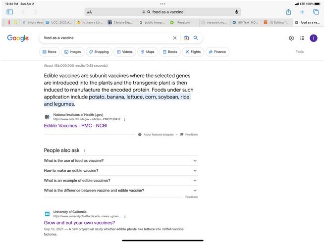 まず、このようなことが起こりうるのかどうかという疑問を解消することから始めましょう。食品にワクチンを混入させるというアイデアは、長い間存在し、間違いなく可能です。2000年当時の素晴らしい記事を紹介します、まさに野菜で行うという素晴らしい絵(3ページ目を見てください)で紹介しています。また、これは、NIH(ご存知、私たちの政府による)に掲載された記事で、食用ワクチンにするために遺伝子組み換えを行う「申請中の」食品について話しています-2013年からのものです。以下は、2023年4月2日(日)にGoogleで「ワクチンとしての食品」を検索したときのスクリーンショットです(Googleはすぐに検索結果を隠し始めると思いますが、その時は4億5600万件の検索結果を返しました!)。