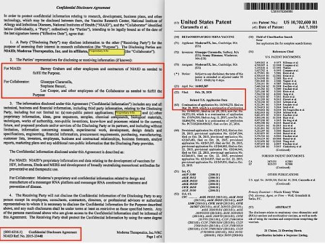 《2016に、 NIHがスクリプス研究所とダートマス大学を通じて特許出願した、WO 2018081318A1『プレフュージョンコロナウィルススパイクタンパク及びその使用』は、モデルナの技術と重複する(併用される)mRNA技術を開示している。モデルナの報告書によると、主発明者のバーニー・スコット・グラハム[Barney Scott Graham]は、モデルナがSARS CoV-2の配列を入手するために「メール」したNIHの人物であり、モデルナのよく知る人物であった。さらに、共同発明者のジェイソン・マクレラン[Jason McLellan]は、2013年にオーストラリアで出願された中国政府と共同所有のワクチン特許でグラハムと一緒に働いていた。》