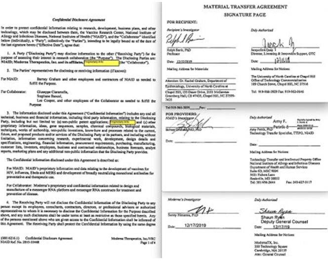 《秘密保持契約(ページ下部のようなもの)には、「国立アレルギー感染症研究所」(NIAID)と並んでプロバイダー「モデルナ」が、NIAIDとモデルナが開発し共同所有する「mRNAコロナウイルスワクチン候補」を、受取人「チャペルヒルのノースカロライナ大学」に2019年12月12日に転送することに合意したと書かれている》と、105ページと108ページの抜粋を掲載し、Exposé編集部員が書いた。