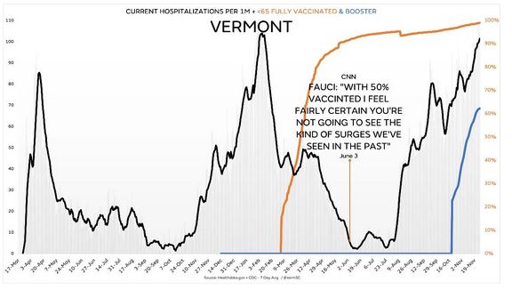 今日のグラフは、従順なバーモント州のものです。バーモント州では、高齢者の99%がワクチンを完全に接種しており、62%がブースターを接種しています。