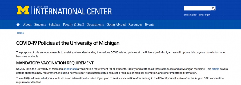私たちはまず、Googleに「ミシガン大学のCOVID-19に対するポリシーは何か」と尋ねました。 検索の結果、大学のウェブサイトへのリンクが表示され、7月30日にミシガン大学が「ワクチン接種の義務化」を発表していることがわかりました(こちら)。ここに関連情報のスクリーンショットがあります。