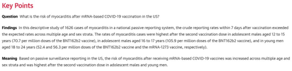 この研究では、CDCのVAERS報告システムから得られたデータを使用し、CDCの心筋炎の定義に準拠していることを確認した。また、VAERSシステムの受動的な性質を考慮すると、報告された事故件数は現象の範囲を過小評価する可能性があることを指摘している。(蛇足:つまり、100倍台ではなく、1万倍くらいはリスクが上がっていると疑われる?とすると接種者の1%くらいに何らかのダメージが、、)