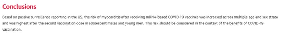 結論として、本研究の著者らは、mRNAを用いたCOVID-19ワクチン接種後の心筋炎リスクは、複数の年齢層および性別層で増加し、思春期の男性および若年男性では2回目の接種後に最も高かったとし、このリスクはCOVID-19ワクチン接種による利益との関係で考慮する必要があると述べている。