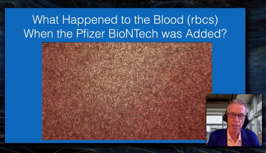 「血液がファイザーのワクチンと反応したところで、赤血球の色が変わり、青白くなります。血液の赤い色は、酸素と、それを運ぶヘモグロビンの組み合わせです。つまり、この2つのうちのどちらかが、両方ではないにしても、ファイザーのワクチンによって変化したということです。そして、目の前で実際に細胞が固まり始めます。ファイザーのワクチン液の中で細胞が動いているのがわかります。初めてやったときの私の反応は『これは非常に不愉快だ』でした。」 (関連:イスラエルの研究では、ファイザーのワクチンと、血栓を引き起こす致命的な血液疾患との関連が指摘されている)