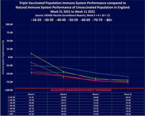 英国政府の最新の発表によると、英国ではトリプルワクチン接種者のほとんどが、ワクチン未接種者の自然免疫系能力と比較して、現在80%の免疫系能力を失っており、これは、ウイルス、細菌、病気、がんと闘うための免疫系能力が最後の20%まで落ちていることを意味している。