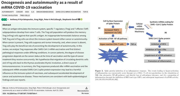 Anthony M Kyriakopoulos, Greg Nigh, Peter A McCullough, et al. Oncogenesis and autoimmunity as a result of mRNA COVID-19 vaccination. Authorea. April 23, 2024. DOI: 10.22541/au.171387387.73158754/v1