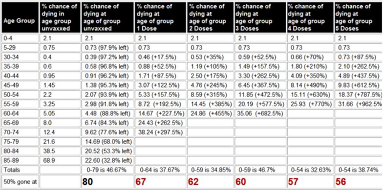 統計的には、彼の同世代の半数は80歳までに死んでいる。英国で5回注射を受けた30歳の人の平均寿命は56歳である。英国人男性が米国人と同じようにワクチンに反応すると仮定した場合である。また、米国の30歳男性も同様に24年の寿命を失っている。