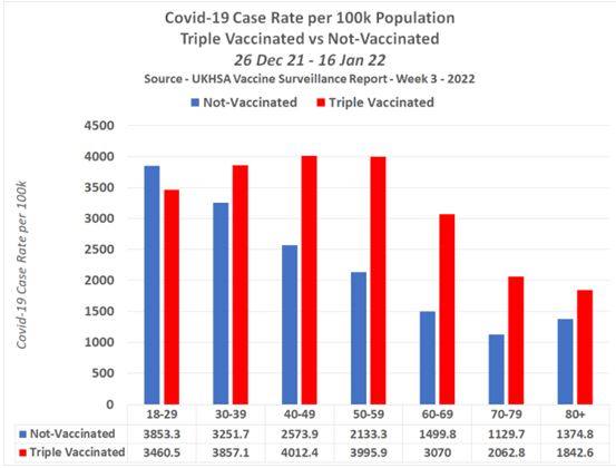 21年12月26日から22年1月16日の間に、100k当たりの患者発生率がワクチン未接種者より低かったのは、18歳から29歳までの3回ワクチン接種者だけでした。しかし、これは2022年1月末までにすぐに変化することになる。