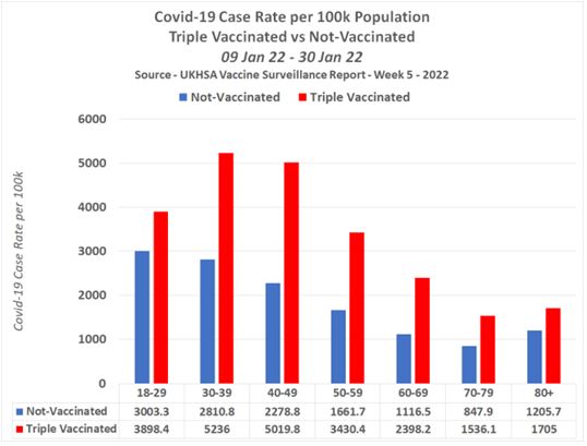 次のグラフは、22年1月9日から22年1月30日までのイングランドにおける3回ワクチン接種者と非接種者の人口100k人当たりのCovid-19症例率を示しています。データはUKHSA Vaccine Surveillance Report - Week 5 - 2022の47ページにある表13から抽出しました。