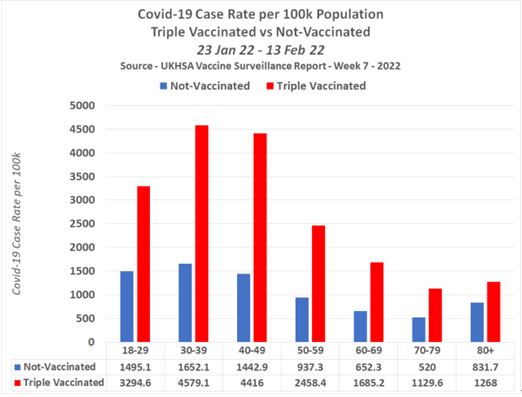 このグラフは、この2ヶ月間でワクチン未接種者の状況が劇的に改善したことと、この2ヶ月間で3回ワクチン接種者の状況が劇的に悪化したことを見事に表現しています。UKHSAワクチンサーベイランス報告書の第3週、第5週、第7週では、10万人当たりの症例数が劇的に減少しており、第5週と第7週の間で最大の減少が起こっています。