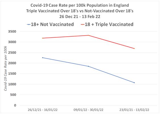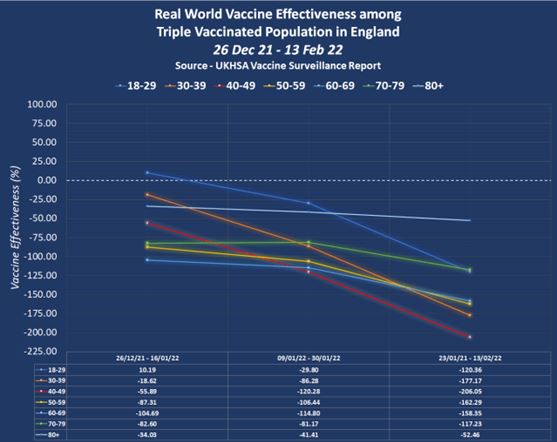 以下のグラフは、21年12月26日から22年2月13日までのイングランドにおけるトリプルワクチン接種者の免疫システムのパフォーマンスを示しています - 。