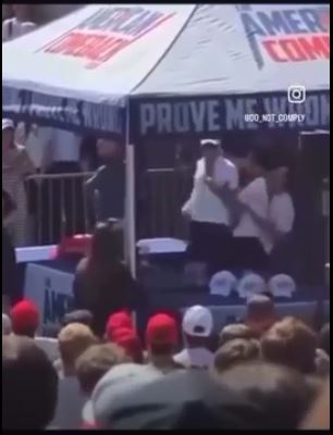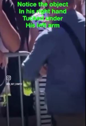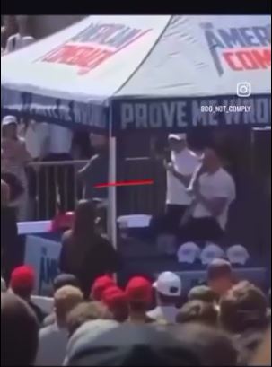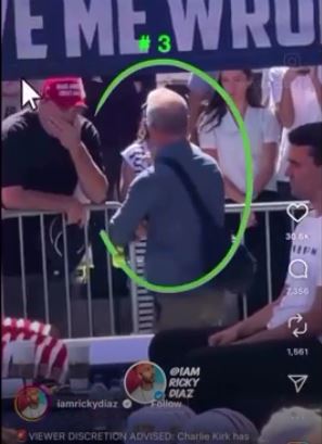 このビデオによると、カークは直接、青シャツの男の左脇から撃たれた。白シャツの男が彼の帽子に触れて信号を送っている。 (注:すでにXは削除済みですが、以下でわかります)