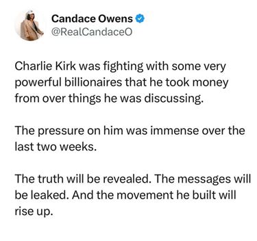 チャーリー・カークの未亡人であるエリカ[Erika]は、彼の運動は死なないとすでに宣言している。彼女はアメリカ全土のキャンパスツアーを続けている。反グローバリスト運動はここからのみ成長する。