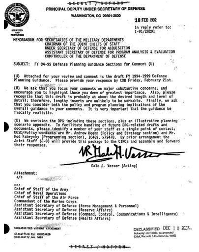 ソ連が1991年12月に消滅した直後、92年2月にアメリカの国防総省内でDPG(国防計画指針)の草案が作成された。作成の中心は国防次官を務めていたポール・ウォルフォウィッツだったことから、この文書は「ウォルフォウィッツ・ドクトリン」とも呼ばれている。