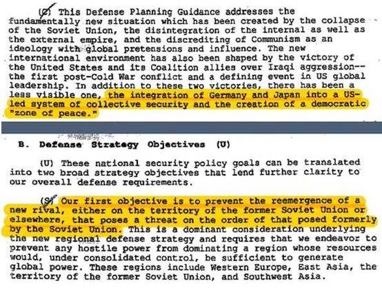 また、旧ソ連の領土内であろうとなかろうと、かつてソ連がもたらした脅威と同程度の脅威をもたらす新たなライバルが再び出現するのを防ぐことが彼らの目的だともしている。西ヨーロッパ、東アジア、そしてエネルギー資源のある西南アジアが成長することを許さないということだが、東アジアには中国だけでなく日本も含まれている。