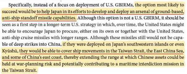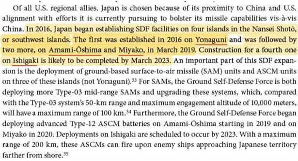 国防総省系のシンクタンク「RANDコーポレーション」が発表した報告書によると、GBIRM(地上配備中距離弾道ミサイル)で中国を包囲する計画を彼らは持っている。自衛隊は2016年に与那国島でミサイル発射施設を建設、19年には奄美大島と宮古島、そして23年には石垣島でも施設を完成させた。
