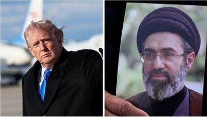 L: US President Donald Trump | R: A man holding a poster of the Iranian Supreme Leader Ayatollah Mojtaba Khamenei (Reuters and AFP)