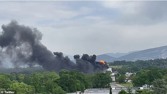 ジュネーブ空港近くのビルで大きな爆発があり、煙が立ちこめている。